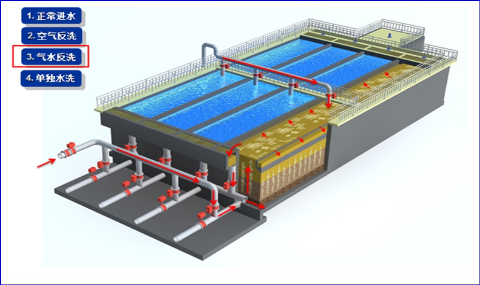 2.2 专有的气水联合反冲冼装置、布气装置、操作工艺等系统集成技术有效解决直接过滤、生物滤池生物膜脱落堵塞滤池的问题;