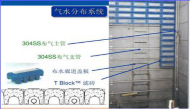 ◇ 气水分布系统:采用“T”型气水分布块滤砖技术,反冲洗不锈钢主、支气 管;淘汰了长柄滤头和滤板。无易损易耗件;